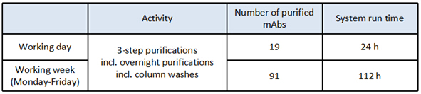 ? ? ? ?Discovery高通量(HT)型系統(tǒng),采用Protein A - CIEX- Desalting三步向?qū)K,每次上樣10 mL單抗上清液(1.0 mg/mL),每次產(chǎn)量均≥6.5 mg。單個樣品的三步純化耗時約為74 min,在24 h內(nèi)純化出多達(dá)19個樣品,而且該時間包含了層析柱的清洗環(huán)節(jié)。該系統(tǒng)持續(xù)運行5天,純化樣品總數(shù)量高達(dá)91個。