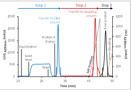 ? ? ? ?在該過程中,Protein A的洗脫組分經(jīng)過在線稀釋,直接上樣至CIEX層析柱,CIEX進行線性洗脫,去除降解物及聚集體,將目標(biāo)組分直接上樣至脫鹽柱。三步層析緊密銜接,前一步層析的洗脫與后一步層析的上樣同時進行,使得純化效率顯著提高。