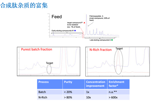 ? ??? ?N-Rich工藝是微量物質(zhì)的富集過程,比如將產(chǎn)品的相關(guān)雜質(zhì)選擇性地富集在一個循環(huán)的層析過程中,待富集至目標(biāo)量,再進行洗脫回收。該方法特別適用于分離與產(chǎn)品有關(guān)的雜質(zhì),如異構(gòu)體和聚集體,并同時用于發(fā)現(xiàn)研究。
