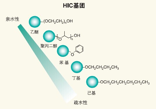 ??? 東曹公司提供5種具有不同疏水性和選擇性的HIC填料。疏水性由弱到強(qiáng)的順序為:乙醚(Ether),聚丙二醇(PPG),苯基(Phenyl),丁基(Butyl),己基(Hexyl)。Toyopearl Hexyl和Butyl常用來分離低疏水性的蛋白;Toyopearl Ether常用來純化疏水性很強(qiáng)的蛋白質(zhì),比如單克隆抗體和膜蛋白,這兩種蛋白會和其他疏水介質(zhì)結(jié)合的非常牢固而導(dǎo)致低的回收率。若客戶對樣品的疏水性不十分清楚,一般建議客戶先選用中等疏水性的Toyopearl Phenyl做條件的摸索。