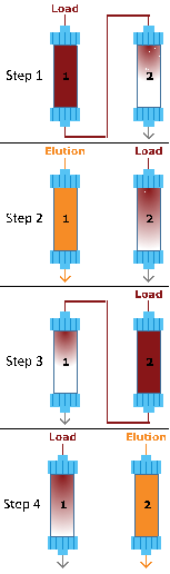步驟?1:在連續(xù)上樣階段,柱1和柱2保持串聯(lián)。柱1滿(mǎn)載樣品(紅色),其流穿被柱2捕獲。