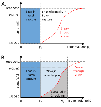 圖2.普通層析和PCC載量利用率對(duì)比圖。圖A為批處理上樣。在批處理的捕獲過(guò)程中,當(dāng)樣品出現(xiàn)流穿時(shí),上樣必須結(jié)束,從而避免樣品損失。圖B:在2C-PCC連續(xù)上樣階段,第1根層析柱進(jìn)行上樣,直至出現(xiàn)流穿(例如70%流穿),流穿樣品被第2根層析柱捕獲。因此,第1根層析柱的載量利用率得到顯著提高。