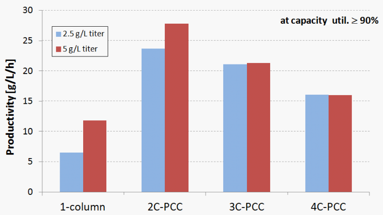 圖3.載量利用率> 90%的多柱位系統(tǒng)產(chǎn)量對(duì)比圖。其顯示了典型上樣濃度2.5 g/L和5 g/L的影響結(jié)果。2C-PCC比普通批處理和更復(fù)雜的3柱位、4柱位設(shè)計(jì)更具優(yōu)勢(shì)。*