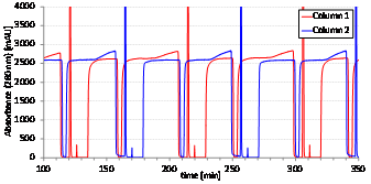 圖4. 2C-PCC系統(tǒng)的每根層析柱都有其專(zhuān)屬的UV檢測(cè)器位于柱后。層析柱連接后,第1根層析柱的流出端UV信號(hào),也同樣是第2根層析柱的流入端UV信號(hào)(見(jiàn)上圖UV1)。AutomAb? 監(jiān)測(cè)第1根層析柱的流出端UV信號(hào)并保證mAb持續(xù)上至第2根層析柱。