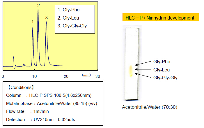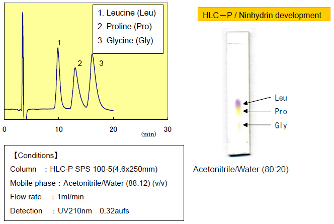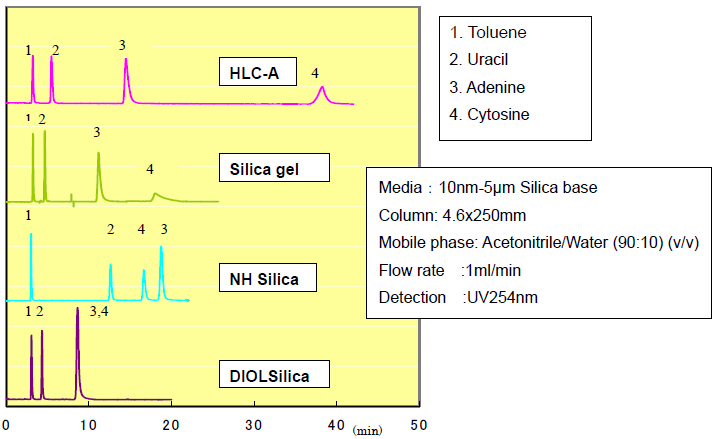 ????因此,對(duì)于極性化合物的洗脫,HILIC模式和反相模式是互補(bǔ)的。富士硅化學(xué)有限公司開(kāi)發(fā)了兩款HILIC模式的填料,命名為“HLC”硅膠。兩種HLC硅膠都含有兩性的官能團(tuán),共價(jià)鍵合在硅膠表面。“HLC-A”用于分離純化有機(jī)酸、核酸和糖類(lèi);“HLC-P”用于分離氨基酸、多肽。