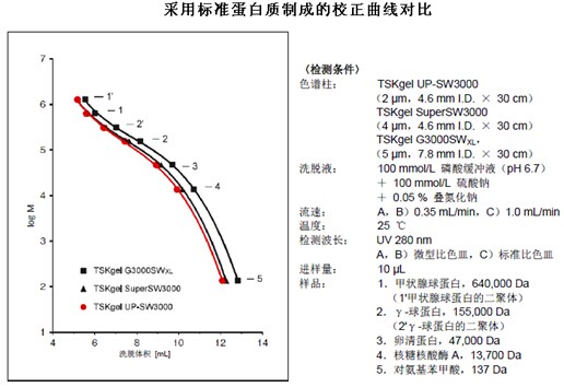 1.?對標準蛋白質(zhì)的分離(與現(xiàn)有產(chǎn)品SW系列色譜柱的比較)