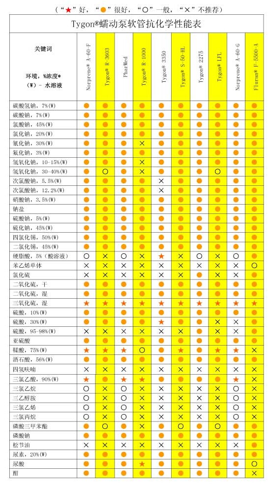 4、溫度:泵頭管不同材料有不同的溫度表現(xiàn)。有些管材如硅橡膠具有較寬溫度承受范圍,對(duì)高溫、低溫過(guò)程均適宜;而有些管材如Tygonˉ 及 C-Flexˉ則只適于某一較小的溫度范圍。最終用戶在選擇管材前,應(yīng)先弄清系統(tǒng)中的最高溫度和最低溫度,然后確保所選泵管安全工作于此溫度區(qū)間。