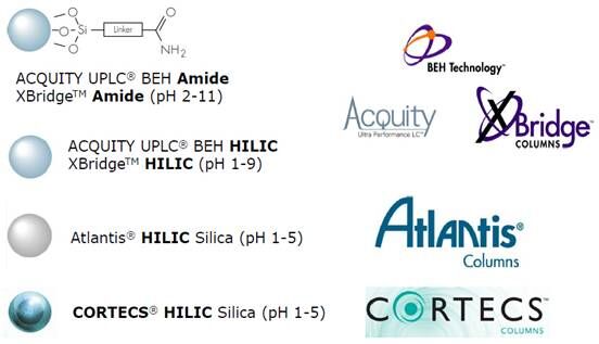 1. HILIC柱是親水相互作用色譜柱 2. 保留和分離極性化合物,如強極性堿或含胺的極性有機物等 3. HILIC提供與反相色譜柱互補的分離選擇性 | 1. 反相方法無法保留強極性化合物的用戶 2. 需要與反相色譜柱互補選擇性的用戶 3. 期望提高質(zhì)譜響應(yīng)與檢測靈敏度的液質(zhì)聯(lián)用的用戶 |