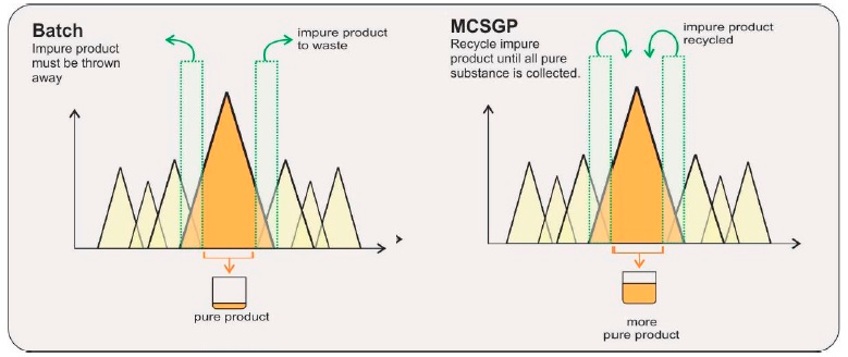 MCSGP工藝,可將含有不純組分的產(chǎn)品回收在一個封閉的環(huán)內(nèi),進(jìn)行循環(huán)式的層析操作,從而最大限度地提取純產(chǎn)品,使得收率和純度二者兼得。