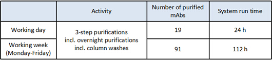 ??采用Protein A - CIEX - Desalting三步向?qū)K,每次上樣10 mL單抗上清液(1.0 mg/mL),每次產(chǎn)量均≥6.5 mg。單個樣品的純化耗時約為74 min,在24 h內(nèi)純化出多達(dá)19個樣品!而且該時間包含了層析柱的清洗環(huán)節(jié)。該系統(tǒng)持續(xù)運(yùn)行5天,純化樣品總數(shù)量高達(dá)91個。