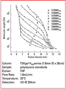 3. Hhr型色譜柱為常規(guī)的GPC色譜柱,尺寸為7.8mm ID x30cm。當(dāng)使用此類常規(guī)色譜柱時(shí),大多數(shù)的HPLC系統(tǒng)無需進(jìn)行針對(duì)柱外峰展效應(yīng)的優(yōu)化。