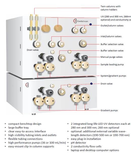 所有的Contichrom系統(tǒng)均具有完整的層析工藝運(yùn)行能力,支持多種洗脫模式,ChromIQ軟件可以提供純化向?qū)Чδ埽灾С峙a(chǎn)工藝的設(shè)計和執(zhí)行。