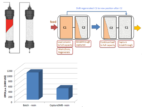 傳統(tǒng)層析工藝,由于流穿效應(yīng),有30-50%的填料是無法被完全利用的,從而使得載量和處理量大為受限。Capture SMB用于優(yōu)化捕獲環(huán)節(jié),作為最簡單和最強(qiáng)大的2柱位設(shè)計,可使純化效率顯著提高,并且使填料用量大為縮減。
