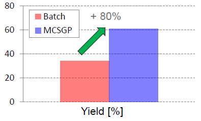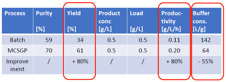 有案例證明,MCSGP可將產(chǎn)品純度從傳統(tǒng)工藝的59%提升至70%,將收率從傳統(tǒng)工藝的34%提升至61%,從而使產(chǎn)量(g /L /h)整體提升80%,并同時使Buffer的消耗量降低55%。MCSGP工藝,無疑可顯著地節(jié)約成本投入,并可產(chǎn)生更多的生產(chǎn)效益。