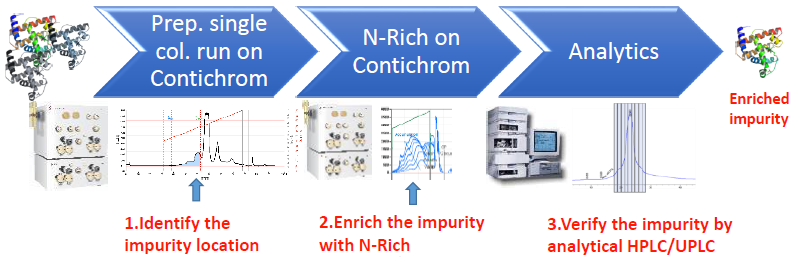 N-Rich工藝是微量物質(zhì)的富集過程,比如將產(chǎn)品的相關(guān)雜質(zhì)選擇性地富集在一個循環(huán)的層析過程中,待富集至目標(biāo)量,再進(jìn)行洗脫回收。該方法特別適用于分離與產(chǎn)品有關(guān)的雜質(zhì),如異構(gòu)體和聚集體,并同時用于發(fā)現(xiàn)研究。
